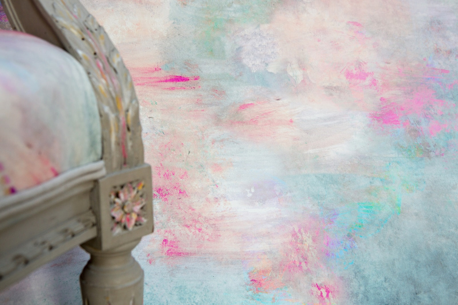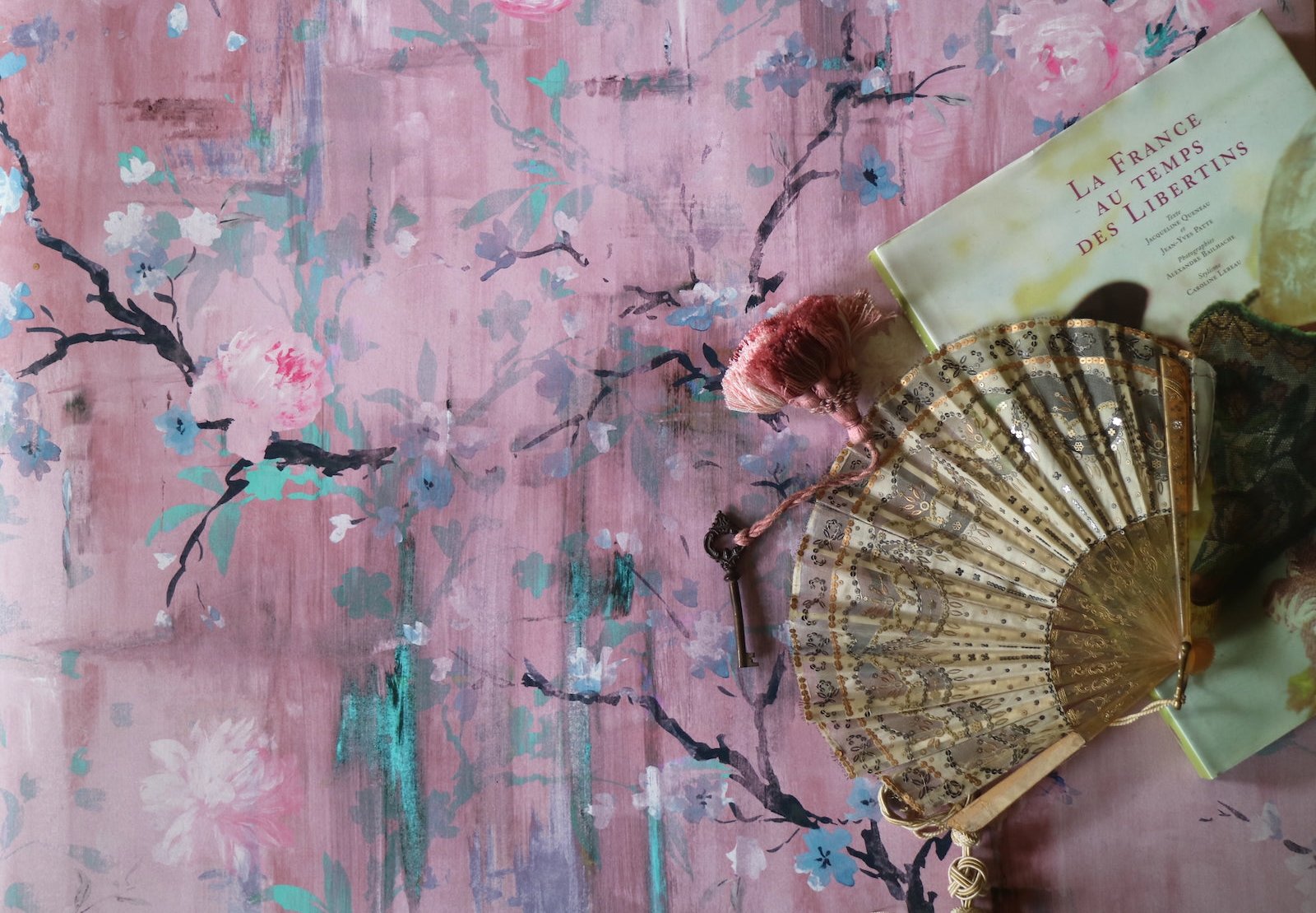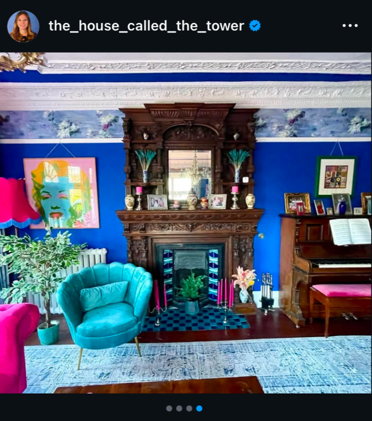 "I have three different designs of Salon Libertine's wallpaper at The Tower, and I love them all in completely different ways. In my lounge is a huge, carved oak Art Nouveau fireplace. The tiles that surround the grate and hearth are glazed in turquoise and deep blue. I decided to paint the walls of the room to match the fireplace tiles. I bought every sample pot of blue paint I could find in Brewers, but I just couldn’t match the rich purple undertone of the tile glaze. Victoria came over, took one look at the tiles and told me I needed ‘Prussian’ by Designer’s Guild. She was right, of course. Everyone who walks into my lounge for the first time comments on how perfect the colour match is. Although I was delighted with my walls, the space above the picture rail was bothering me. It looked ‘unfinished’ in white, but the ‘Prussian’ paint was too bright to take right to the top of the wall. I’d also recently acquired a couple of bright pink Chesterfield sofas - an impulse purchase that would need to be brought into the room’s colour scheme. Victoria mentioned that the flowers in her Salon Libertine wallpaper design ‘Nature as Art’ were a purple-toned blue and would complement the walls and tiles. Coincidentally, the touch of pink in ‘Nature as Art’ was exactly the same shade as my new sofas, so it really was the most perfect choice! Filling the gap between the picture rail and the ceiling with the beautiful Salon Libertine wallpaper instantly pulled the whole room together and created an ‘interior-designed’ look that I could then build on with other furniture and accessories. It’s my favourite room in the house."