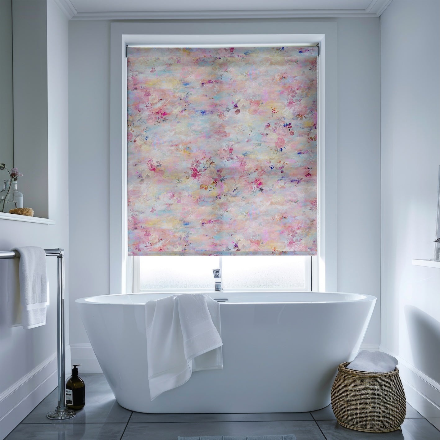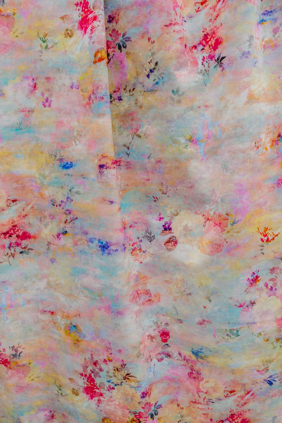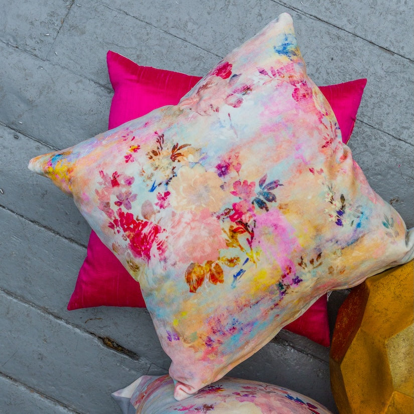 ‘Fleeting Magnificence’ is inspired by breathtakingly luminous winter sunsets; an attempt to capture the impossible and ephemeral beauty of our skies. Cold, clear, pale blue skies and clouds are set alight with fiery accents and semi-transparent layers of fuchsia, violet, ultramarine, mauve, yellow and orange. Whilst traditionally handled clusters of gouache painted flowers, derived from Sèvres porcelain decoration, play across the canvas.