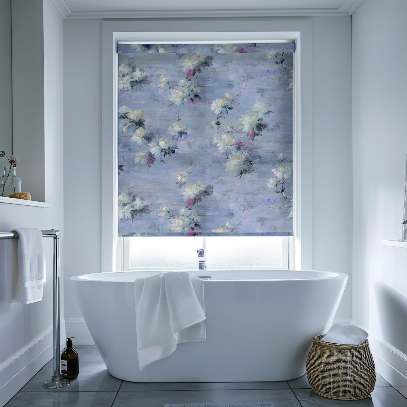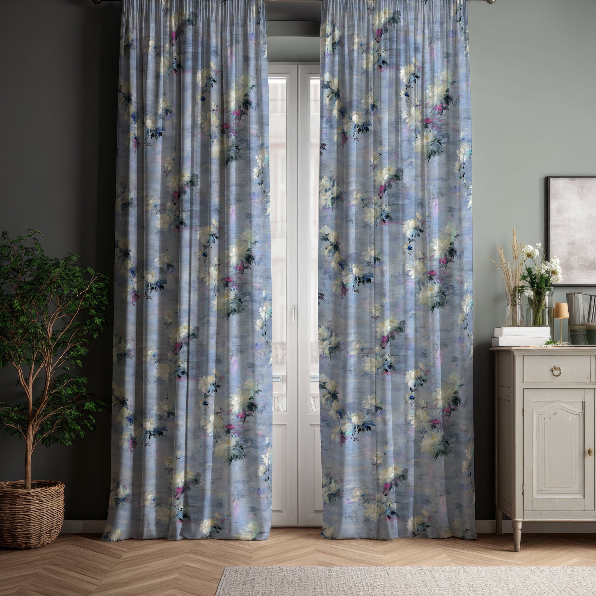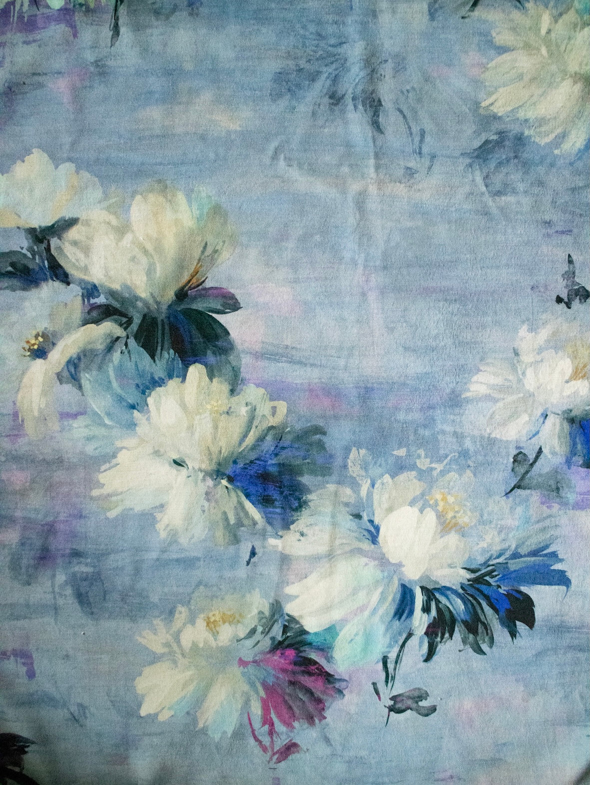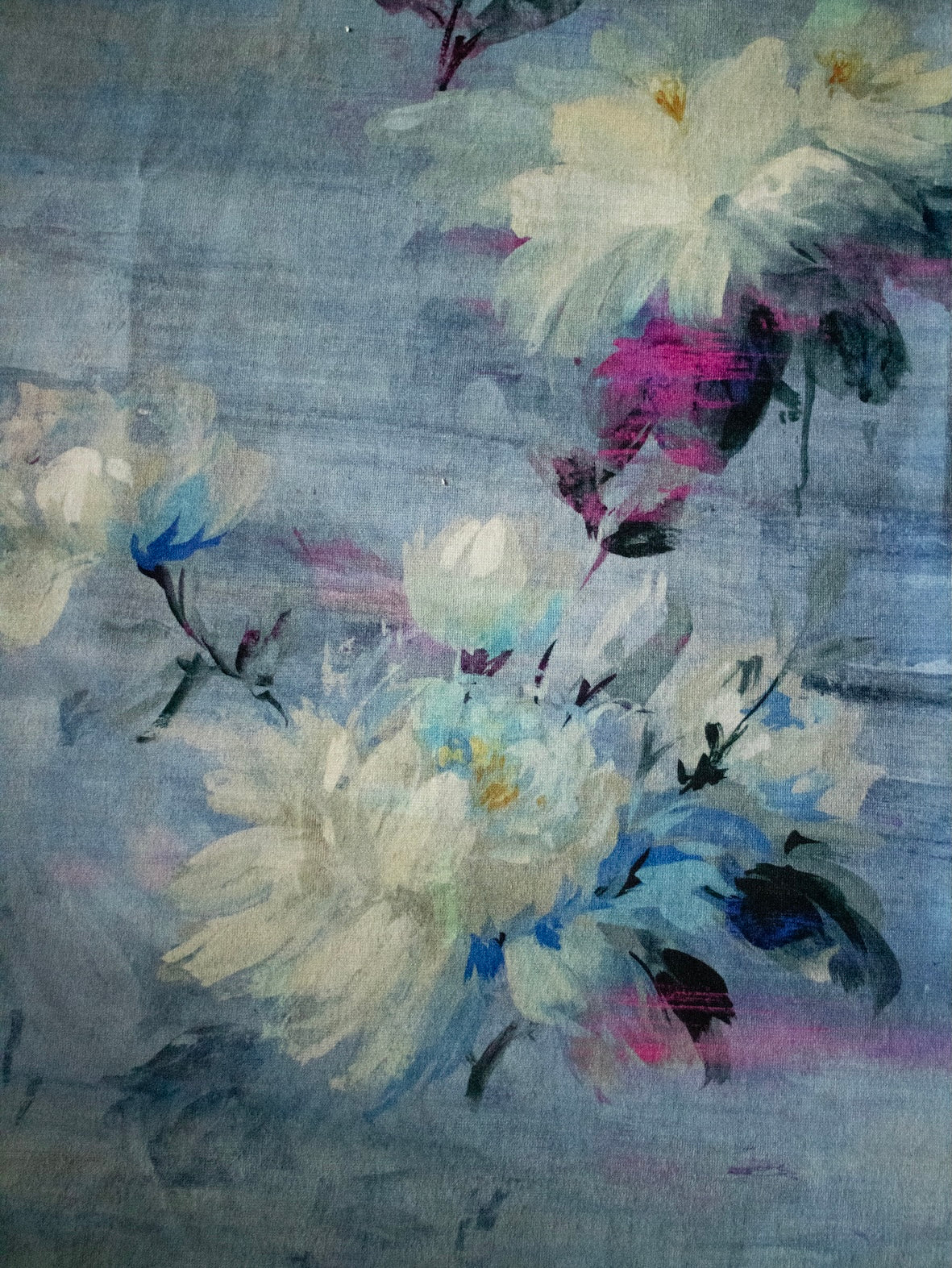 ‘Nature as Art’ is a traditional composition made timeless. Exquisite loosely painted roses gather informally across a richly layered background of gentle mauves, chalky blues and subtle greys, from which diaphenous flowers emerge and recede. The serene nature of the design is punctuated with vibrant shots of fuchsia, ultramarine, aqua and purple