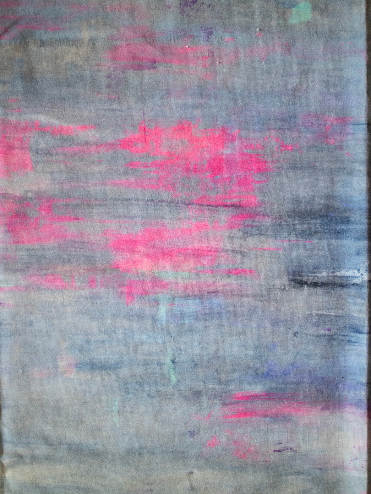 The impressionistic dance of a brightly coloured sky reflected onto water. Vibrant accents of ultraviolet and aqua add depth and texture to the chalky blue grey and mauve ground.