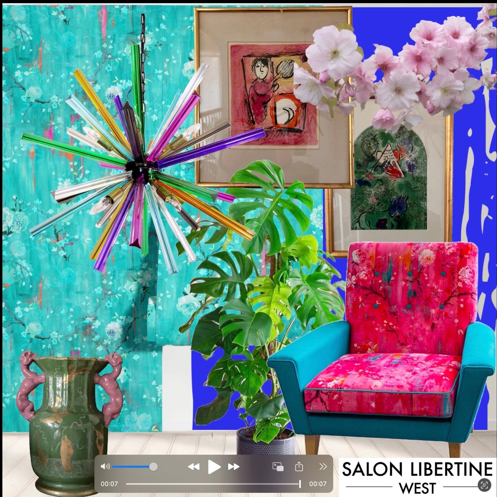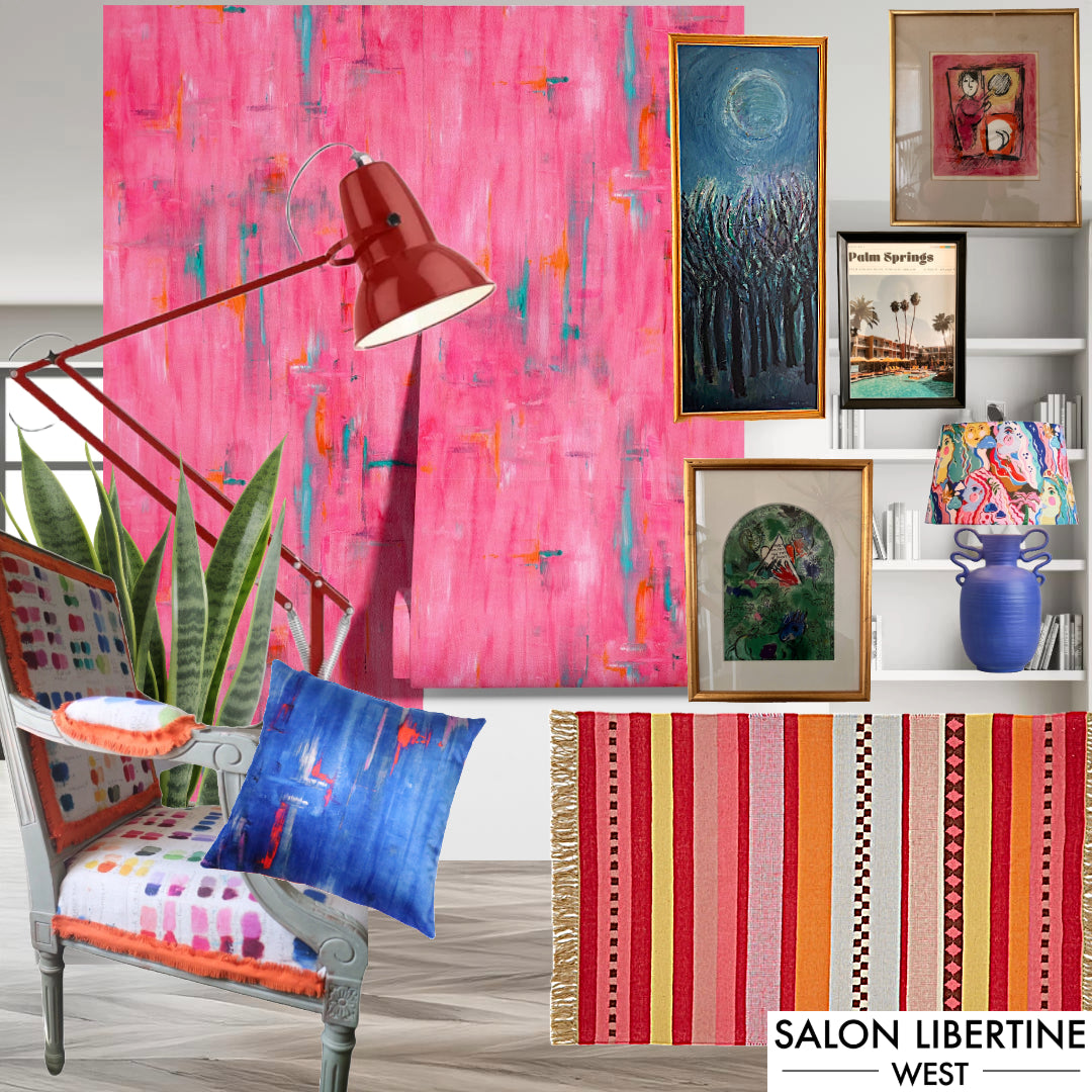 A joyful aesthetic is created with the hedonistic summer colours of our Perfumes of the Night wallpaper, layered with brilliantly colourful accessories and vibrant paint. Opt for Little Greene's 'Ultra Blue, as an accent colour. Add statement pieces in the form of antique ceramics and bold furniture. This chair was made bespoke in Shropshire, England, by Mark and Heather Maskill at The Little Furniture Shop. Lithographs or limited edition prints of striking artworks are an affordable way to dress your space and finally add an incredible light, like this Murano glass Sputnik, (we sourced ours on Vinterior) for a maximalist and energetic space.