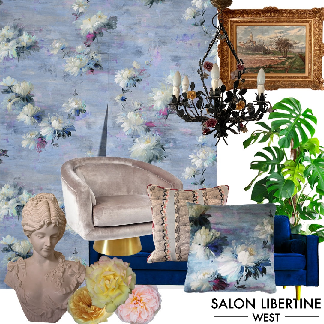 Even with today's taste for bolder design, florals are still often perceived as too feminine to use outside of the bedroom or bathroom, but by combining these with sharper contemporary pieces, you can extend its use throughout your home. Combine a contemporary sofa and armchair with metal legs with an eclectic mix of antique lighting, objects and traditional artwork. Look to sofa.com's 'Prussian' velvet for the deepest, richest blue, which works perfectly with the violet undertones of the floral details in the wallpaper. Add texture and depth with an abundance of cushions in different fabric types and patterns. Mix designs to match the wallpaper from our own range, with complimentary patterns like this old Lacroix design here. Bacharach chair by Jonathan Adler