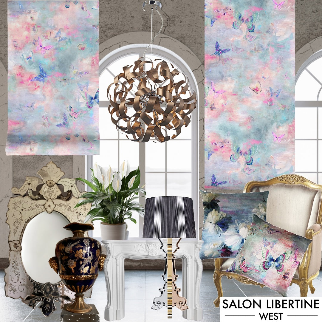 Give this beautiful traditional design a contemporary edge by pairing it with modern classics, Kartell's epic Bourgie lamp and Dar's Ribbon pendant light. Source this classic French style armchair from Sweetpea & Willow. Rococo French fireplace surround from Stevensons of Norwich. Mix with 18th and 19th Century antique pieces for a timeless, elegant and eclectic look. This is a balanced look where neither the antique nor the modern aspects dominate. The metallic elements across the accessories serve to unite the modern and traditional aspects and bring cohesion to the scheme.