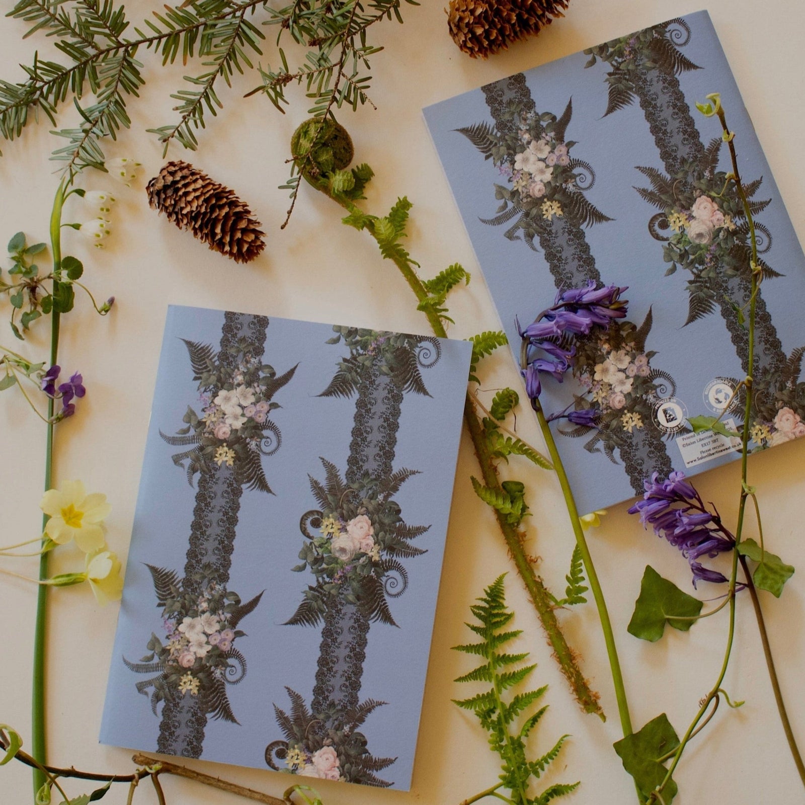 Our latest collection, 'Forest Floor', reflects a shift in direction following our move to the heart of Devon, fed by the moods of the region's timeless forests. Walking to discover locations for chilly wild-swims, lead us through the ancient and evocative woodlands of the Dartmoor National Park. We are constantly drawn to the forest floor and banks, observing the wildflowers and foliage given life by the plentiful Devon rain. Within the dramatic designs, stylised and moody twisted fronds of ferns and ivy leaves are enlivened by ornamental woodland flowers. Formally handled 18th century styled roses are included simply for the ornamental delight they bring. In keeping with our previous work, hand-painted elements are at the fore, but this time these are juxtaposed with key graphic-elements to create decorative depth. 'Forest Floor' is available on exquisite stationery, gift wrap and tote bags.